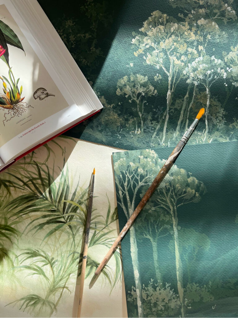 Conception et réalisation de papiers peints entièrement faits main, uniques et sur mesure.